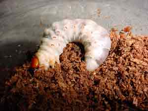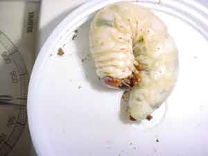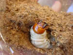 マットから菌糸へ マットで飼育していた山梨産です。重さは量りませんでしたが、二令で体長約3cm位ですから多分5g位だと思います。 ※14年11月10日 撮影 |