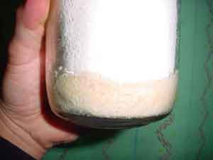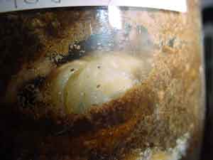 水分過多 動きが無く心配していた菌糸ビンの一本です。写真では分かりにくいですけど下の方に3cm位水が溜まっちゃっています。 ※15年2月26日 撮影 |