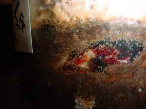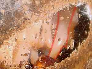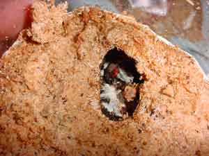 蛹に 外出から帰ってきたら蛹になっていました。(上の写真のその後です) 赤い線で輪郭を描いたところが大顎です。♂でした。 ※15年2月11日 撮影 |