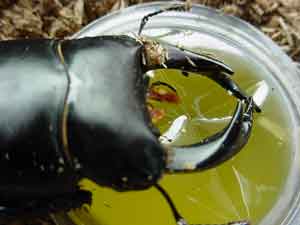 冬眠中断 この頃部屋が暖かく、一足先にオオクワ♂が冬眠から醒めたようです。去年178号室で羽化した福島産。もう2日も食べっぱなしです。大顎の間の茶色いところがクワガタの口です。刷毛のようになった口でゼリーを舐めています。 ※15年3月1日 撮影 |