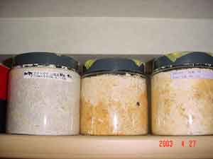 彼らはいったい...? 菌糸ブロックから作った大型ブロー容器の山梨産です。左は去年10月に、中央と右は今年1月に入れ替えたんですが、まったく動きがないです。掘っていいものかどうか?掘って蛹になっていたら困るし。でも放って置くのが良いのかな?蛹化していればそのうち出てきますからね。 ※15年4月27日 撮影 |