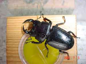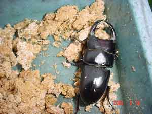 もう一匹は ♂でした65mmで同じ親の山梨産です。ウチではまだオオクワ♂の70mmオーバーは出ていないんです。もう一個のビンはまだ幼虫でした。(写真はありません)今年は蛹化しないかも。 ※15年5月18日 撮影 |