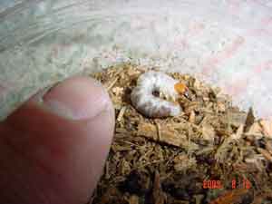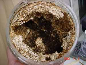 中は 外見からは想像付かないほど、中は食べてありました。ほとんど食べ尽くしたと言っても良いかもしれません。サイズはまだそれほど大きくなく。蛹化もまだのようなので、不経済ですが新しい菌糸ビンを買って引っ越しました。羽化は来年かな? ※15年7月5日 撮影 |