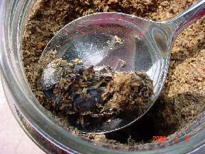 糞 菌糸ブロックの用意ができず、交換時期を過ぎたまま使っていたビンの内部です。スプーンで掘るとネッチョリって感じです。ほとんどウンチですね。財政難のため通常のマットに引っ越しです。(T_T) ※16年2月23日 撮影 |