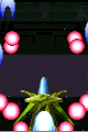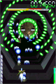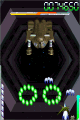 ボスが sin カーブを描くように左右に動きながら、縦方向に高速緑弾を発射する。どこで避けても大して難易度は変わらないため、ボスに体当たりするように横方向にくらいつき、弾を当て続けるのが効率的。 リハイド/ブルードラゴン や、ヴィズ/レッドタイガー は移動速度が遅い。この速度が大体ボスの横方向移動速度で、この2機体だと割合簡単に避けられる。ファラ/イエロースネーク や リハイド/ダークフェニックス だと、横方向に動かしては止め、動かしては止めを繰り返すことになり、難易度が上がる。 |