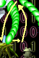 画面下部に移動して、誘導レーザーを4発打ってくる。多分 ヴィズ/レッドタイガー 以外ではダメージを与えられない。じっくりエネルギーゲージを回復する。 画面中央より多少下部に位置し、初めの2発は左端に、その後大急ぎで右端に移動する。するとレーザー攻撃を振り回せ、4発打ち終えた後に画面右上角に移動すると、レーザー攻撃は全然怖くない。ボスを画面端で持ち上げれば、後の極太レーザーが楽になる。 |