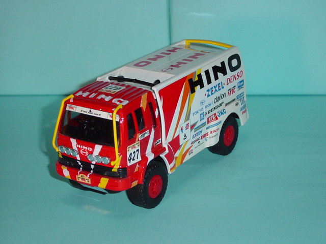 | 続く97年は、前年の勢いをそのままに中型部門のクラス1と同時に大型のクラス2を含めたカミオン部門総合で、日本製トラ ックとしては初の総合優勝を達成した。さらに同一チームとしては史上初の1−2−3フィニッシュと上位を独占した。 一方のエムテックは、前年と同様に97年12月頃にMR−06のC(ゼッケン427)とD(同402)としてリリース。基本的 には96年モデルと同じで、車体部分のマーキングはタンポ印刷、荷台部分はラベルで処理。両方とも同じ塗装の様だ が、フロントのロールバーなどが427はイエロー、402はレッドに塗られている。さらに402の屋根に飾られている鯉のぼり もつまようじを丸めることで貼ることができる。なお、402は販売数限定品である。 |