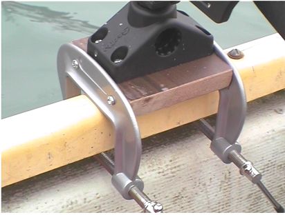 カベラズで購入した樹脂製のロッドホルダーを板とアルミ製のクランプ2個を木ネジで止めました。