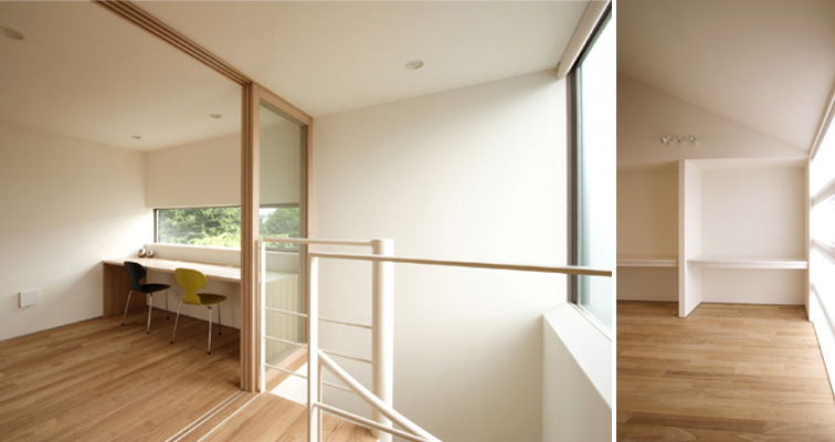 2階は子世帯の専用フロアになっています。フリースペースを大きくとり、書斎コーナーや上部にロフトを設けています。将来の子供室として、