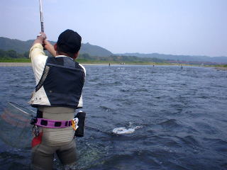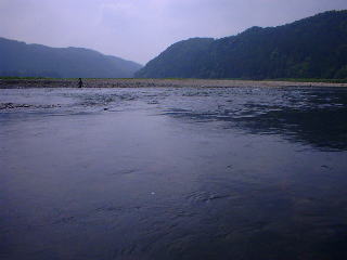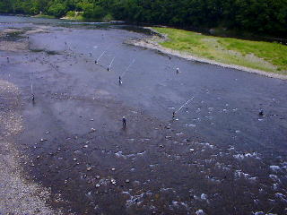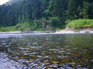 | 第2の目標地”矢沢の簗下”に行くことにする。 私も、5匹では納得行かないと、真剣に攻める。だが、掛からない。 ”がまかつ”の人達が沢山いましたが、その人達もあまり(そんなに?)掛かっていなかった。 石・水・食み跡。非常に良いが掛からない。 私たちが行く前に”がまかつ”の人達が一番鮎を全部掛けてしまったのか? |
