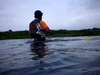 囮をつけて(昨日ロープを押さえた石に)、のんびりと準備を整える。 10:00ちょっと前竿を出し始める。 膝まで入ると底が見えない。 追わないな? 10:00過ぎ頃、ドン玉が掛ける。 16cmサイズと小さい。深場で掛かったそうだ。 こうなったら、トロ瀬の深場で交通事故狙い&大鮎狙いだ!と 濁りが入っているにもかかわらず、アホな考えがよぎる。3本チラシ登場。 思川にて胸まで立ちこみ!芯の横狙い。・・・・・・・・・・ やっぱりダメっす。 (ついでに川底の状態を体で確かめたかった) 川底は、小石も小石。スグに足場が掘られ首まで立ち込むはめに! 岩盤はなんか柔らかい感じだ。 頭くらいの石があれば大石だ。よって底流れが強い。 11:30昼食タイム。 みんなつまらなそうに、車に戻って来る。 夕方に賭ける・掛ける作戦。(普通) やはり、ゆっくりお昼休みを楽しむ事に。 日が射してきた。夏の太陽が戻って来た。 今日は止めよう、真剣に釣りを!?そう思うも? 「一本いっとく!」なんてビールを誘う”アチャ” 「早帰りでも、流石に時間がたてばさめるベ!」と”ドン玉” 速攻で迷い無く「いただきま〜す。」 昼過ぎ、”暴れナイト”が息子2名を連れて登場。(留守電を入れといた) 今朝、実家の岩手から帰って来たそうだ。ちょっと眠そう。 「さし入れでーす」とスーパードライ。 アチャ:「もう一本いっとく!」だって。 13:00過ぎ、ヘチ際での人に竿が立ち始める。 「暴れナイトの囮を獲る!待ってってね。」と午後の部開始のドン玉。 それに続き、準備を整える僕。 (本日Uターンラッシュを恐れ早帰りを決め込む私の為) 橋下の早瀬で、数回竿を絞っていた。ドン玉。 (ドン玉の引き抜きシーン。暴れナイトが激写。いずれ公開予定?) (「別にいい?」 「まあ、そんなこと言わずに」) 瀬落ちの浅場で、少々泳がすと約20cmが掛かってきた。 でも心臓直撃。痛恨の硬直鮎。 ヤバイ、非常にヤバイ状況。 もう仕方が無い、トロ瀬の深場に養殖囮を投入する作戦に! 背バリ、錘、チラシ。筋の対岸側にぶち込み 24cmを狙いたい! やはりPMも胸までの立ち込み。・・・・・・・・・失敗。ダメっす。ギブアップ。(涙) 後ろで笑ってる人がいる。ドン玉がいつのまにかおいらの後ろにツケマイしていた。 15:00前車に戻る。 子供達と遊ぶ事にする。 代わりにに”暴れナイト”が準備を始めた。 ドン玉から2匹の囮を預かったとの事。(でもピンシャン鮎じゃあない) 橋下の早瀬を攻めはじめる。 そのうち、アチャ&ヒロ親子が上流部からあがってきた。笑顔は見られない。 やはり子供達と遊び出した。 |
