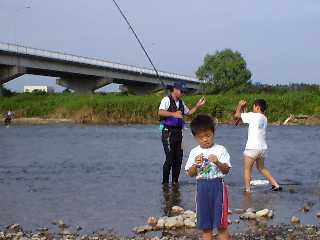 | 16:00過ぎ。水が大分澄んできた。水量も減ってきた。 まわりの人達の竿がポツリポツリと立ちはじめた。 アチャが再スタート。背バリで岩盤筋の強い流れに囮をぶち込む作戦だ。 僕は着替えて帰る事に。 16:30 「じゃーねーまたねー」とみんなに車から手を振る。 その直後の出来事。(車のkeyを回した時) アチャの竿が完璧にのされた。すぐさまダッシュしている。(強烈だ)。 ある程度竿に角度がついたところで”返し抜き” 完璧に決まった。 帰り際、良い映像を目撃する事が出来た!!! その後夕方までに数尾。同じ場所で掛けたとの事。 夜はこのネタでダイナマイトトークだろう!! ちょいと竿出し!には良さそうな今年の思川。の感想。 17:00 ドン玉宅へ荷物をとりに。 長女が”小山西”の戦いを応援していた。 熱い応援だ。 結局、延長サヨナラ負け。 泣いてたかなあ?気になるな?? おかげさまで、楽しいお盆が過ごせました。 渋滞にも会わず、スムーズに帰宅することが出来た。 |