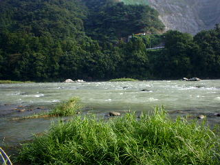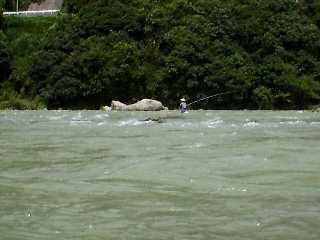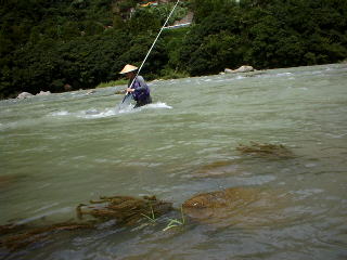 | 8月25日(日) 本日4日目の九頭竜川。 坂東島にやってきた。 ここ九頭竜川で代表するポイント。 やっぱり激っている。 ポイント一面が瀬だ。 上に岩盤の深瀬を 下には、毎年3人くらい命まで流されているという強烈な流れ。 その下には泳いで渡り、岩にしがみついて釣る!という大鮎ポイントもある。 本日もEgaoさん、ドン玉、僕での3人での釣行。 この場所もEgaoさんがいないと、向こう側へ渡るのは辛い場所。 この場所も感動する。 一面瀬。強い瀬。 ここに入っている人達はみんなウェットスーツ着用。 |