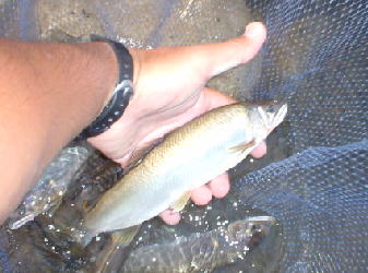 ここは、瀬あり深瀬ありチャラありと変化のあるポイント。 でも攻めるのは瀬。 たまにズルしてヘボい所を攻める俺。 いきなり首までの深瀬に入り、ぽんぽん掛けるEgaoさん。 まわりの人と話すと、「あの人だけだ〜掛けてるの!」 と、Egaoさんを指差す。 |
