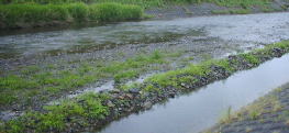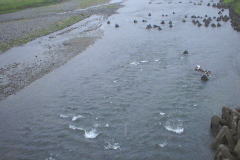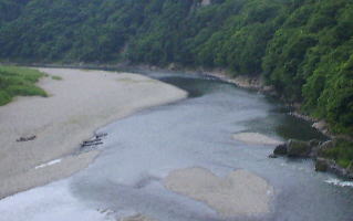 | 若鮎大橋 外は結構な雨が降ってきた。 すでに合羽は着ているが!! 岩盤がくっきり顔を出す。 鮎の生命感は感じられる(小) |