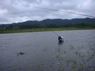 | 数分後 なべちゃんも始めた。 その後ちょっとして、竿を曲げる。 いい調子だ・・・・・・・・・・・・・・・・!!!!! そっからが問題だ。 那珂川鮎ハンターの3本チラシ氏が改名した。 サインボハンターに 奔流のサインボはパワーが違うらしい。 さ〜て、我らも囮を購入しにいく。 2003スタートだ! 興奮する。 ハナカンを通す指が緊張する。 あぁ気持ちいいぃぃ。 手前を攻めても、結構流れがある。 ちょっと奥に入れると 囮が流されちゃう。 そういうときはそういう時は なんだっけ? おっつ 錘。 結局 はじめっから 錘の釣り。 これだよこれ。 なかなか来ない。 数十分後、1時間くらいたったのか?? 芯近くにぶっこむ。 ビュビュッツ。 キた!! 3チラ&なべちゃんが見てるよぉ〜。 キャッチミスなんてもってのほか。 シュパッツっ 気持ちいいいいいい〜。 タモを伝わり、鮎の香が漂う。 天然ちゃん 背鰭ビラビラ。ナカナカサイズ。 あぁ、最高。 鮎釣り おもしれ〜。 でも続かね〜〜 その後も粘る。ケラレらしいのがあるが、 流れてくるゴミ@アオノロには勝てない。 ようやく時間がたって 12cmくらいの鮎ちゃんをGET。 幸い僕にはサインボ〜が掛からなかった事が良かった。 ここはサインボ釣りのエリア?なの? ハードスペシャルをしならすドン玉!良い背掛かりかと思いきや、 サインボーーをぶち抜いてやろうと思っていたらしい。 でも糸が切れちゃったんだって。 笑える。 HASHIさんがやってきた。 初めまして。いつもお世話になります。 荒川でちょこっと釣りをして、黒羽を見に行き釣れていない!との情報。 「ファイト〜一発!」な差し入れまで頂いてしまった。 ありがとうございました。 移動 烏山に行くことにした。 |