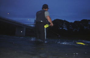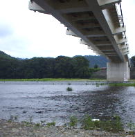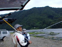 | 9:00頃 烏山大橋より上下流を眺めると、もう10数名の鮎師が 竿をベタに構えている。 ここで雨さんと合流。 水は結構増えている。濁りもそんなに無い。 こりゃあいいんじゃん!! あとは水温が気になる。 囮は鴨川軍団がいっぱい持っている。 やる気マンマン! ウェットを装着し、橋直下〜攻めることに。 |