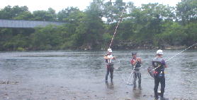 | 先輩以外の3人は 帰ることに。 太陽はギンギンに米代川を照らしつけている。 「先輩 頑張ってくださ〜い」 当日午後 藤琴に移動し、17尾掛けたそうだ。 翌日 奔流にて 4?尾 やっつけたそうだ。 やるゼ 先輩。 その次の日 最上水系に動いたみたい。 うわっつはっつはっつはぁ〜って勢いで。 我らは 鹿角でラーメンを食べ。 (しかし俺の剃り込みも本物だなぁ〜 北の奔流に載せられて改めて感じたよー。) (すっげー 良型天然鮎が俺の額をハンでんだなっ。) ここで ドン玉師匠から 得意のセリフが 「楽しけりゃいいんだよ!楽しけりゃ〜」 「そぉ〜ッスねぇ〜」 鹿角道の駅でお土産を購入し、東北自動車道路をぶっちぎり。 盛岡南でsu-sanに手を振った。 >su-san 本当にありがとうございました。 今回遠征での総評 なんだかんだで 楽しすぎたッス なにしろ 鮎中毒は 「お笑い系鮎サイト」 ッスから ????? ”北の奔流”は違いますよね????? |
