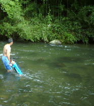 泳いじゃえぇ〜〜 川遊び開始!! 短パンに鮎足袋をはいて。 気持ちいい〜 |