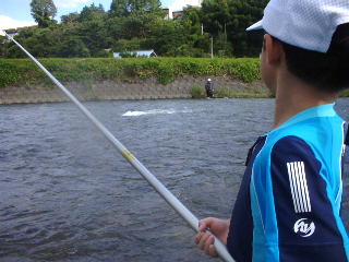 物産センターの店員さんに聞いてみた。 「ここって放流してるんですか?」 「いや、全然放流してませんよ〜 でも禁漁区ですよ〜!」 「あっつ、禁漁区なんですか〜 でも鮎いますね〜 勝手にのぼって来たんですね」 移動 「そんじゃ、鮎釣りしようか〜」 「やるぉ〜 やろ〜」 今日は息子(もうすぐ5歳)に竿を持たせると約束した。 ふれあい橋下 大森囮屋で囮購入 いざ出発。 今日は奔流が濁りでダメなため 釣り人が結構いる。 しかも日曜日。 竿は6.3m マミヤ名将!! フロロ0.4号通し。 囮を装着し・・・・・ どうぞやってちょうだい。 |