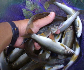 | んん〜 太陽はどっかにいっちゃった!! でも増水の引き際 今日は掛かりそうな気がする 一応目標は「バ」だ。 なんぼ掛ければ 「バ」なの? 武茂川なら 30掛ければ「バ」成立だろ!! ヨシっつ とりあえず目標20尾 と設定。 8:30開始 狙いは 俺の瀬!?? 今日の仕掛けは昨日の息子の仕掛けをそのまんま! 小場所だからいいだろ!! 6.3mに 0.4号フロロ通し。 2分で来なければダメなポイントに送り込む。 1分30秒? ググッツ! 竿がしなる。 おおっ っつ 楽しいなぁ〜。 慎重にやりとりして、袋タモにおさめる。 20cmくらいの ナイス鮎。 狙い通り。 ポンポンぽ〜ん と 5尾程 同サイズをGET。 のされて、下って、走って、 抜いて。 舟に戻っての繰り返し。 笑える。 しかも、このダッシュがどんどん早くなるの! 誰かに見られていたら出来ないッス。 こりゃ〜 「バ」かな? 調子に乗り出すと。 引き抜き途中に ポロリ 手元の草っぱに 「カサカサ」っと軽くぶつかると ポロリ 涙も ポロリ。 来たッス ・・・・ 水中バレ。 痛い。 来ると ギュギュギュ〜ん。 一気に竿を絞る。 この支流竿 片手で持っててもOKじゃん。 なんで今まで買うだけ買って使わなかったんだろう!! 伊東松川用に買ったんだよな!確か。 湯河原千歳川用だったっけ?かなぁ〜!?? 聖地むも 俺の瀬 1・2 小場所でも増水だと いい感じの瀬ね!! |