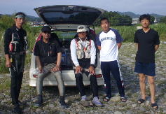 | 河原に到着・・・・・ 九頭竜の流れと同じ位 濃い 雰囲気が漂う。 「お久しぶりで〜す」 腰痛から復帰した大魔王が超元気に出迎えてくれた。 タカさん。 そして、九頭竜の男鮎師 ユウタさん。 「はじめまして」 |