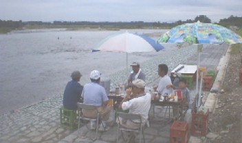 コイケさんがやって来た。 「鵜は大丈夫か?来てねぇ〜か?」 「大丈夫です」 桑島ファミリーがポツポツと顔を見せ始める。 さっきまで見え隠れしていた太陽は雲に隠れ始める。 またこんな天気かよ!!! 委員長がやって来た。 僕らの為に朝食のホカホカ美味しい”おにぎり”を持って。 毎日毎日 ご馳走になっている。 お世話になりすぎて申し訳ございません。 ありがとうございます。 喜楽橋側はあっという間に 人が並んでいる。 風は涼しい 8月も終わりか〜〜〜 足立区から来た Aさんと会った。 「鮎中毒」見てま〜す。 と 「お恥ずかしながら 私が ka2です」 と。 ほんと恥ずかしいけれど、輪が広がる。 色んな情報交換を・・・・・・・・・・・ って 今日は水温が上がらない。 |