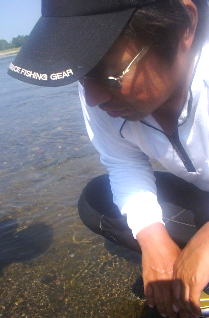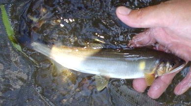 | 僕も竿出し 夏の陽射しを十分に浴びて 底バラシを何回か体験して・・・・ 吸い込む瀬で楽しんで(不発だったけど) 落ち込みで ゴごっつっつン おっ ナイスサイズ |