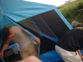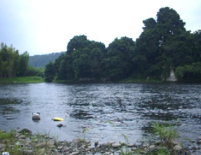 さぁやりましょやりましょっ! 下に3チラ氏 上になべちゃん ずーっと下にドン玉師匠 ナイスな天然囮にハナカンを通し一流し。 ゴゴン 微かな前アタリが・・・・ と書きたいところだが・・・・・ ”ピカッツ”と閃光が走った。 雲行きが怪しく・・・・ 3チラ氏の合図で竿をたたんだ。 なべちゃんは 上に瀬落ちを目指していたようだが,目指しただけで 「おぉ〜まだハナカン通してねぇ〜よぉ〜」 その瞬間 ”バタバタバタバタっバシャ〜”っと夏の大雨が降ってきた。 ドン師匠は”ピカッツ・ゴロッツ”にビビって 中州に竿と舟を置き ビショビショになって車に戻ってきた。 Bをかっ喰らって寝ていた kaneyan先輩が正解!! 我らの斜め上にある送電線にも ”バリバリバリ〜”と数発 鮎釣りは中断だが,心地よいサウンドと爽やかな雨風に チョッピリ う と う と ”バキバキバキ〜ん”って音で目が覚めて。また ウ ト ウ ト と。 |