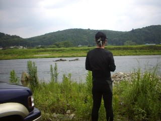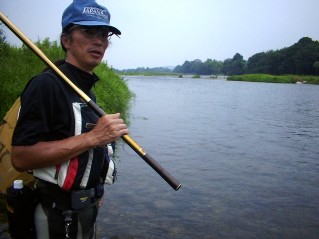 赤岩の瀬肩にて 早々に 3チラ氏が 我らを振り返りながら 返し抜く。 やる気が出てきた。 僕は橋下の流芯を探る。 が 反応は無い あるとすれば やっぱし 青ノロ。 岩盤に揺らめいている。 ユラユラ タカさんが快調に橋直下で竿を曲げている。 手前の筋を攻めている。 橋上まで行って 下りながら探るも んんん〜 掛からない。 網の影響なのか?減水の影響なのか? わからないけど 薄い。 ガンガンまで下がってきた。 タカさんと3チラ氏はもう竿をしまっている。 折角だから入れさせて下さい。 と ガンガンにデカイ錘を装着しぶち込んだ。 が 上手く入らないのか!? 一発じゃ来ないのか?? 強烈な あの 快感を得ることは出来なかった。 移動 マスターズ予選会場 本部近く 下エリア に 主将のポイント案内後 各自がポイントに散れていった。 僕は大石が頭を出す,岩盤エリアを攻めることにした。 大石を挟んで2本に流れが分かれている。瀬落ち〜淵〜瀬肩 ってかんじ。 向こうの流れに 囮を送り込むと しばらくして・・・・・ ビビビビッツっつ〜〜 心地よいアタリで竿を絞った。 やっぱり サイズの割には生意気な掛かりをする 気持ちよい。 入れ難い流れに囮を誘導すると ナイスな黄色鮎が突っかかって来た。 空の具合もグズグズしていて 時折 ゴロロロォン と聞こえる。 入れポンまでも行かないが コンスタントに掛かってくれた。 1〜2時間で 目標のツ抜けは達成する事ができた。 とりあえず抜けたので ダッシュで昼だ!と 車に戻った。 |