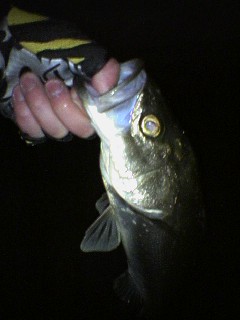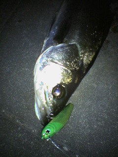 小さそうだが感じ良く暴れている。 竿先を水面に近づけ、魚を疲れ気味にさせ、薄明かりに魚体を確認すると うんやっぱり 小さめ。 以前はこういう確認すら出来ない状態だったのに こんなことも出来るようになったのか!まぁまぁ慣れてきたな! 自分を確認。 でもまだまだだ。 背中に初心者マークをつけることは無いけど(どっかで・・) もっと勉強だ。魚に勉強させてもらおう。 フェンス越しぶち抜きでGET。 35cm程度のやつ。 bu〜ma〜氏に掛けてもらいたい。 まだ居るはずです。ガンガン攻めてください。 だが、bu〜ma〜氏のルアーに噛みつくヤツは現れなかった。 っと・・・・ バシャバシャバシャっ さっきまでオラが攻めてた場所の際でテクトロにて またHITさせた。 災防M氏 ヤルぜ! |