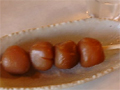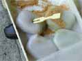 山寺の山門近くのお茶屋さんのお菓子です。山で疲れた体に甘いものはいかがですか??やわらかくておいしかったです。餡を、ヨモギの餅で包みその上からまた餅で包んでいます。うっすらヨモギ色がきれいです。お抹茶と一緒にも頂けます、写真は箱物です。何故箱物を食べてるのか??それは日記を見てね! |