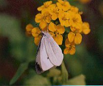 モンシロチョウ アブラナという花にとまっているモンシロチョウです。 キャベツのはっぱにたまごを生みます。 キャベツをうえておくと,たくさんやってきて, たまごを生んでいきます。