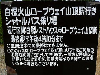 志賀高原経由、白根山 お釜Pに 到着。横浜から所要6時間 Pは普通車=410円 道路をはさんで直ぐ反対側に 無料シャトルバス発着所がある 所要=5分、徒歩でも15分 (1300m)で草津スキー場の白根山R.W終点に到着する。