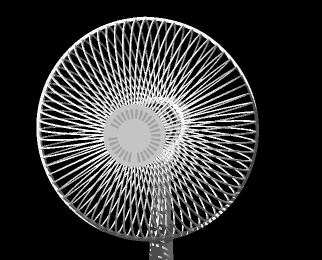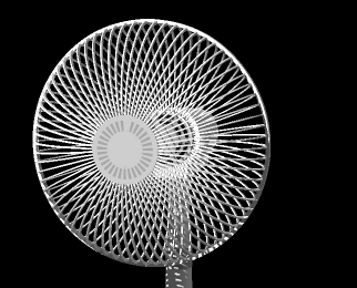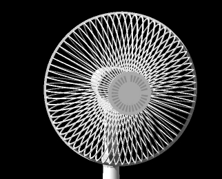 扇風機の前面カバーと背面カバーの規則的な放射状の線が交差する時にモアレ(干渉縞)が現れます。モアレの縞模様は一定ではなく前面カバーと背面カバーの線が交差する位置と角度の変化によって様々に変化します。