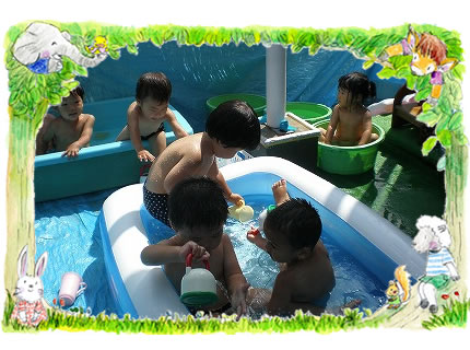 保育園の改築に伴い、仮園舎でのプール遊びは余地でのビニールプールあそびとなっています。が・・・子どもたちはぱしゃぱしゃとにこにこ顔。おもちゃを持ち込んで遊んだり、顔付け・ワニさん歩きなど楽しんでいます。幼児クラスになると水を得た魚のように水しぶきを飛ばし、け伸びなどおてのもの!鎌倉プールを週2程貸し切らせて頂き、滑り台で遊んだり、思いっきり泳ぎまくっています。