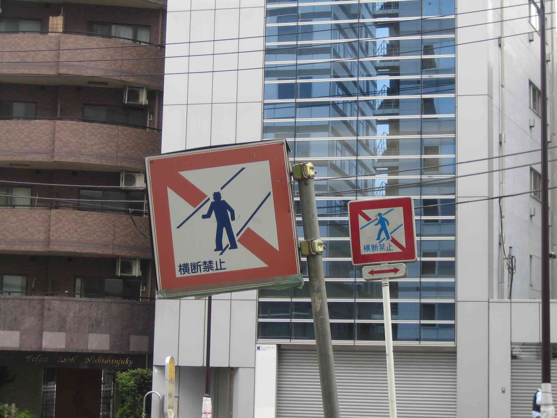 こちらの人物は、今まさに渡ろうとしている。その行為が禁じられていることを赤の斜線で示しているわけです。となると、手前の標識は、「待ちなはれ!」と、とめる行為を禁じているのか? (2011年6月撮影)